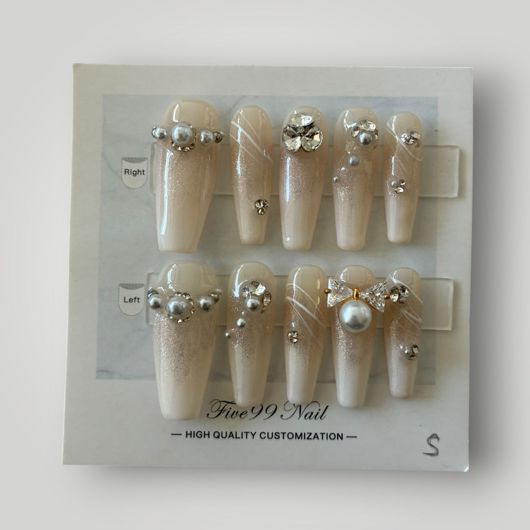 Understated elegance meets feminine charm. Blush Muse features a soft nude-pink shimmer base, adorned with delicate pearls, micro-crystals, and a crown-like 3D gem bow. Whether you're walking down the aisle or heading to brunch, this set brings quiet luxury to every hand movement.