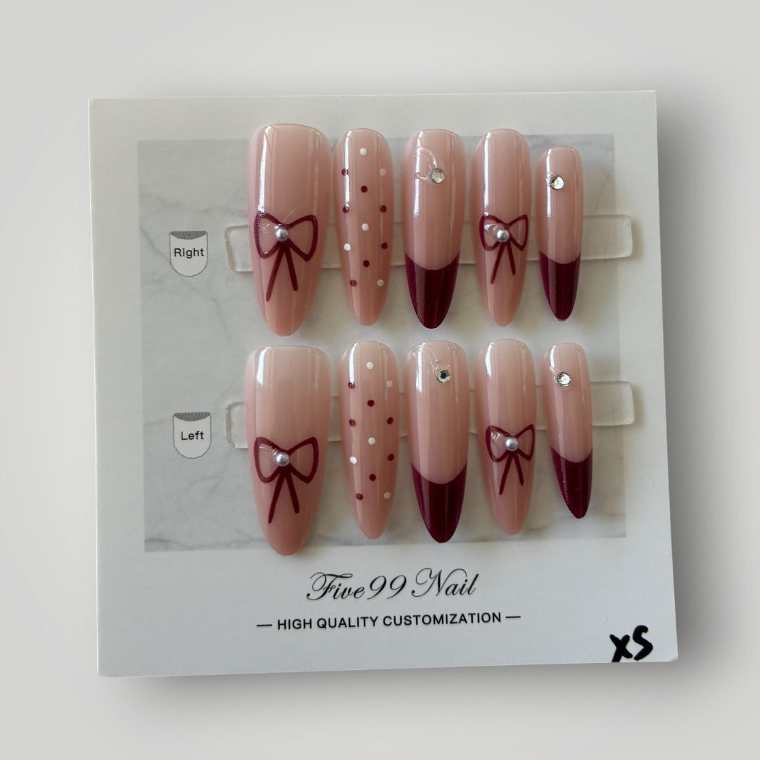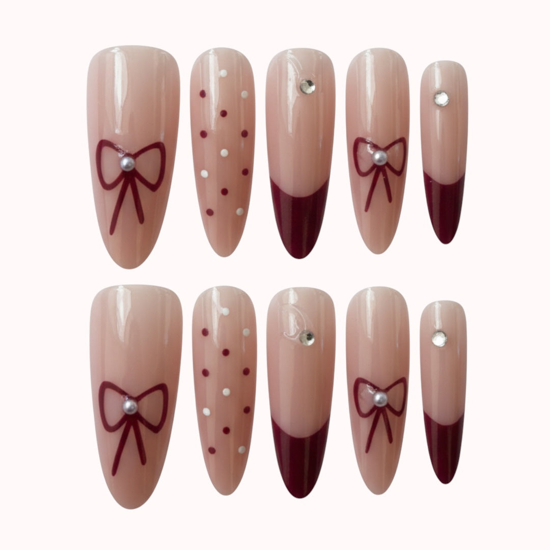 Elegant with a playful twist, Cherry Bow Charm features a glossy deep red French tip paired with a clear jelly base. A standout red ribbon design with a pearl center brings a hint of sweetness, while scattered dots and gem accents add texture and charm.