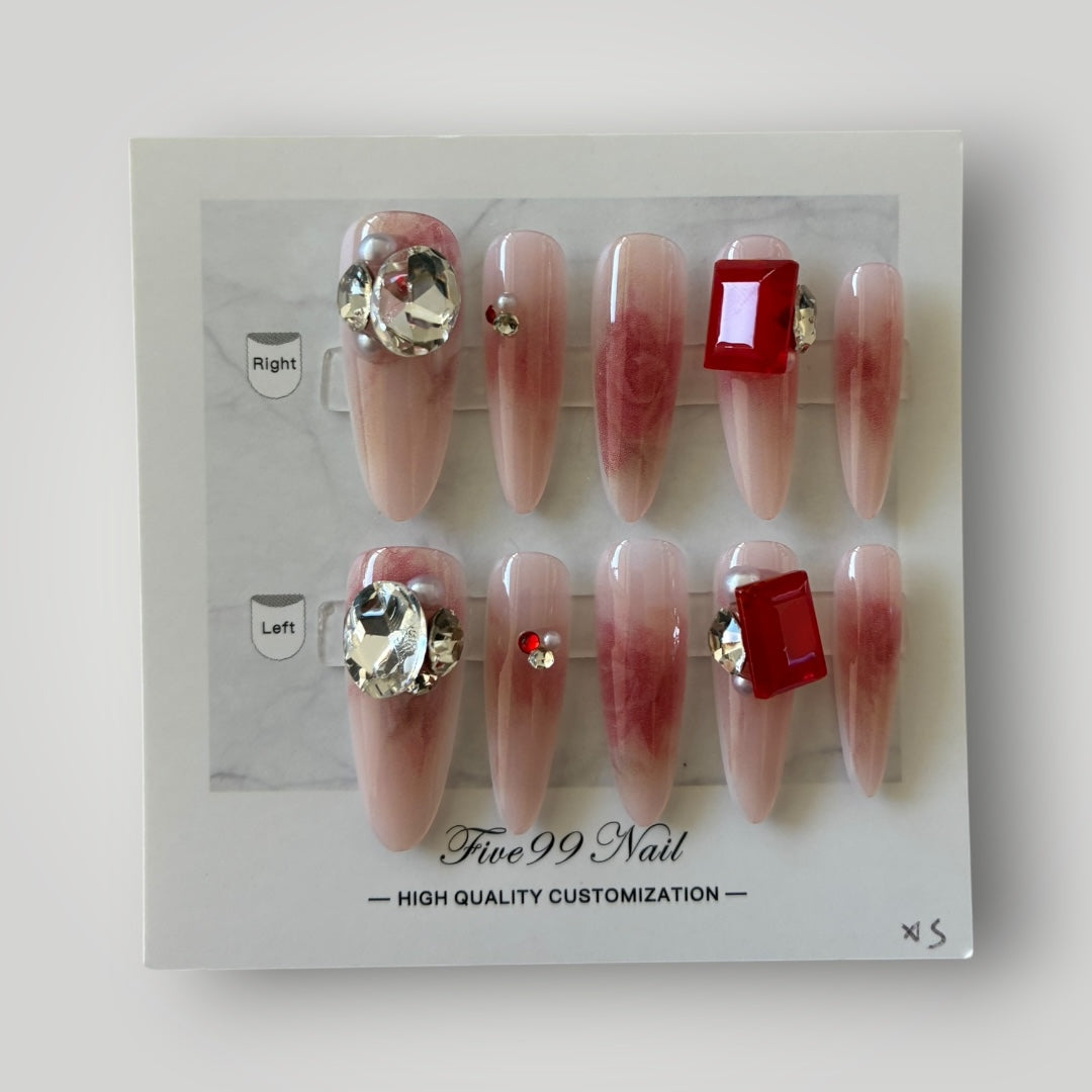 A swirl of elegance and danger. Crimson Stain features a sheer nude base with deep red marble ink flows and is adorned with gemstone-like ruby accents and micro crystals. Each nail feels like a glass of spilled merlot β moody, rich, unforgettable.