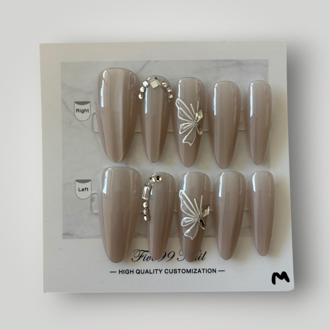 A graceful shimmer in motion. Crystal Fade features a cool grey cat-eye gradient base, delicately crowned with shimmering crystal accents and a 3D bow on the ring finger. Itβs the perfect blend of ethereal elegance and modern shine.