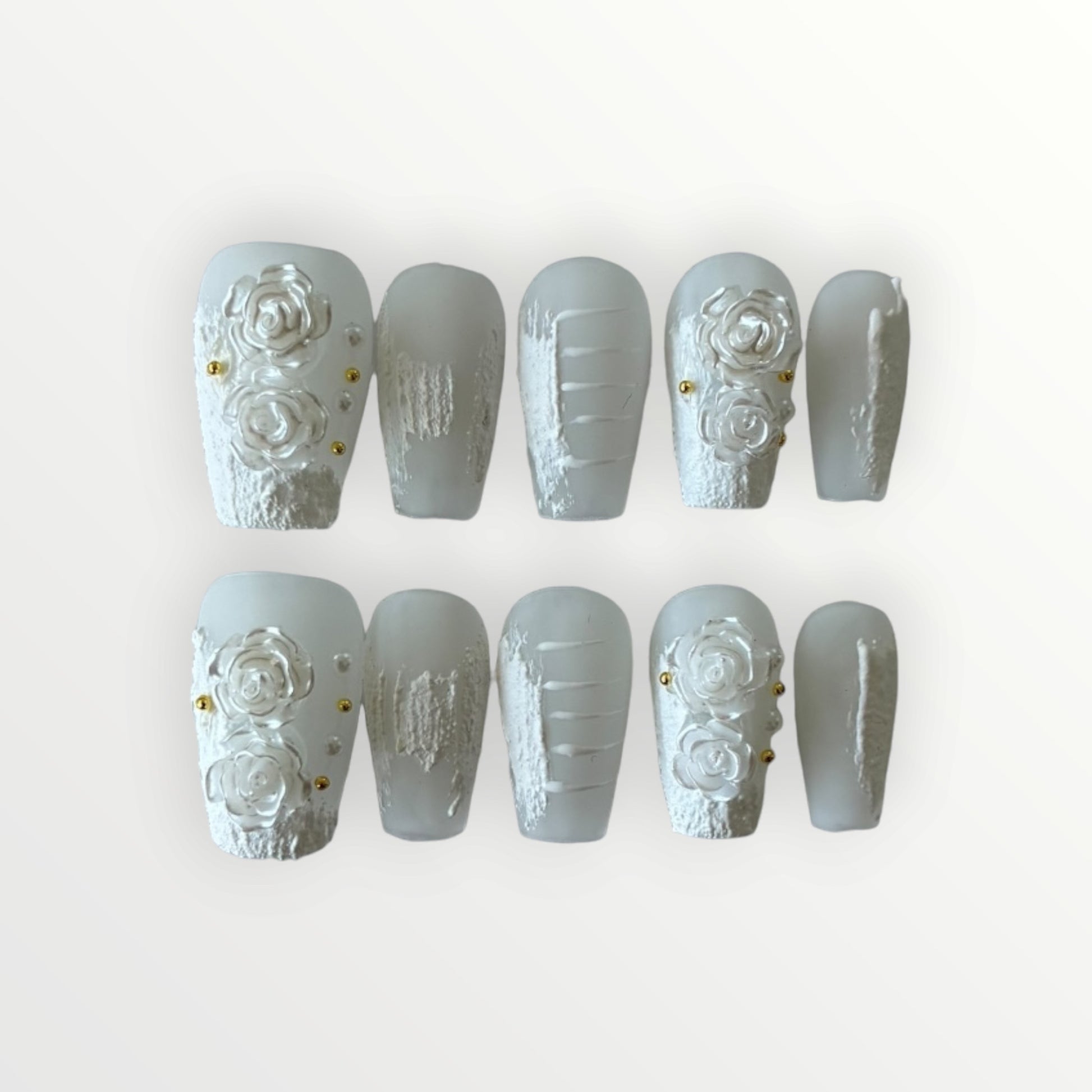 Elegant and timeless, this set features matte frosted white nails with intricate 3D rose details and subtle gold beads. The soft texture and layered design evoke a romantic bridal feel β perfect for weddings, anniversaries, or any sophisticated winter look. The combination of matte and glossy textures adds dimension while keeping the overall tone pure and delicate.