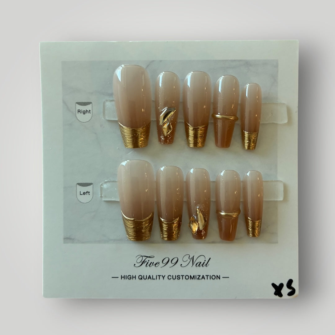 A refined nude-to-taupe gradient elevated with bold golden tips and metallic accents. This design strikes the perfect balance between minimal elegance and statement luxury β versatile enough for office wear while glamorous enough for special occasions.