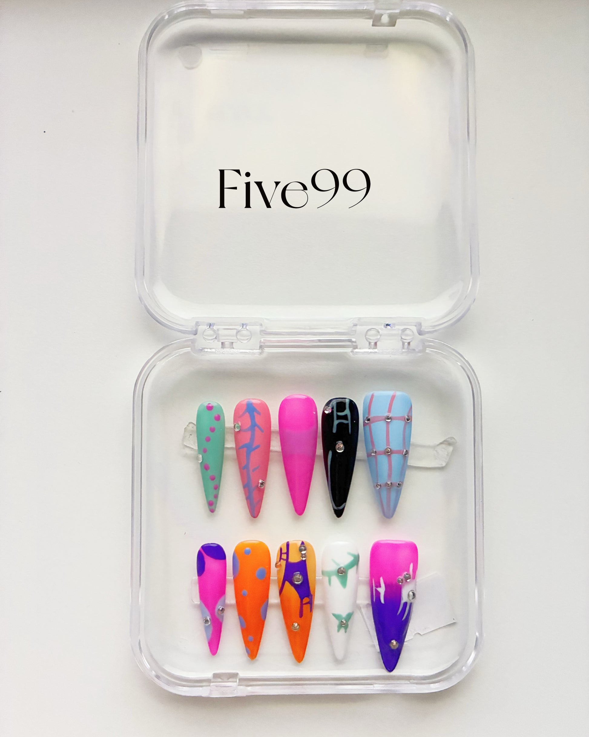 Color, chaos, and creativity — Graffiti Pop is a bold press-on nail collection handmade by me, where no two nails are the same. From dripping paint to bright stars, neon dots, and electric grid lines, this set is made for true originals who don't do "basic."