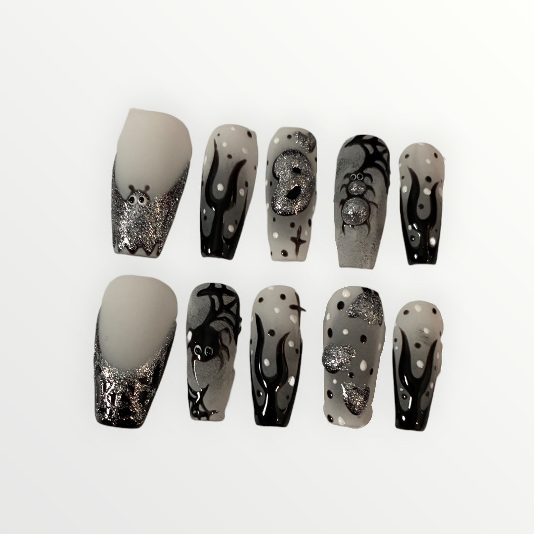 Step into the dark side with Midnight Web, a hauntingly elegant design that blends matte white and glossy black with shimmering silver. Each nail features hand-painted webs, silver glitter flames, and 3D accents that capture the mysterious charm of Halloween nights. Perfect for those who love a gothic yet chic vibe.