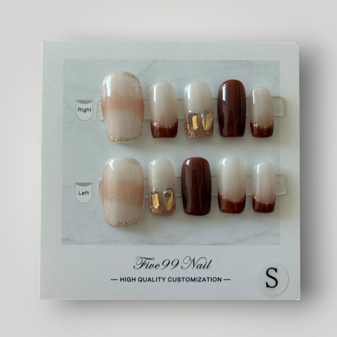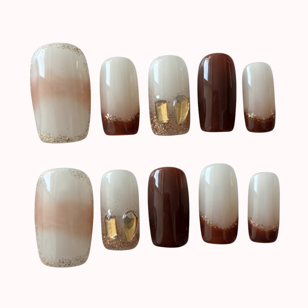 A creamy nude-to-ivory gradient paired with rich mocha brown accents and golden heart embellishments. Finished with subtle glitter detailing, this design is warm, romantic, and perfect for cozy autumn days or sweet date nights.