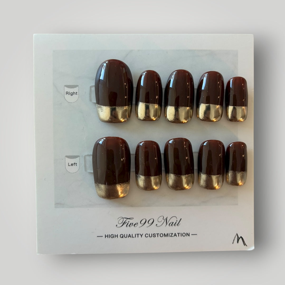 Elegant with a touch of fire. “Molten Merlot” features a rich, glossy burgundy base paired with bold metallic gold French tips. The result is luxurious yet edgy—perfect for evenings, events, or when you want to make a strong, sophisticated statement.