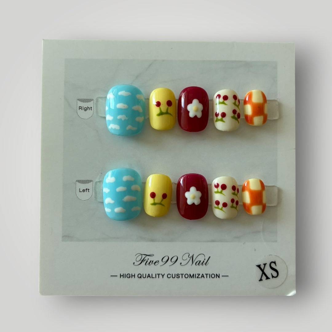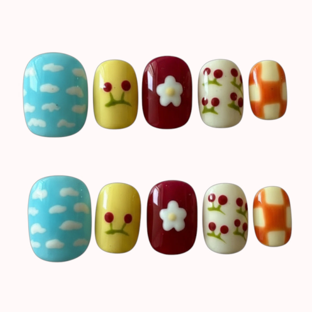 This playful set is a burst of sunshine in nail form! Inspired by a cheerful summer picnic, it features bright sky-blue clouds, cherry doodles, gingham orange patterns, and 3D white flowers on a bold red base. Each nail is different but harmoniously matchedβperfect for anyone who loves quirky, cute, and colorful nail art.