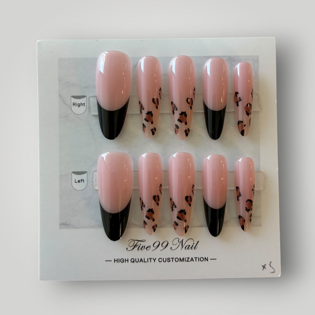Bold, clean, and fiercely fashionable. Savage Chic features alternating designs: transparent leopard-tipped claws and glossy black French points β all balanced on a soft blush base. Itβs where wild instincts meet polished perfection.