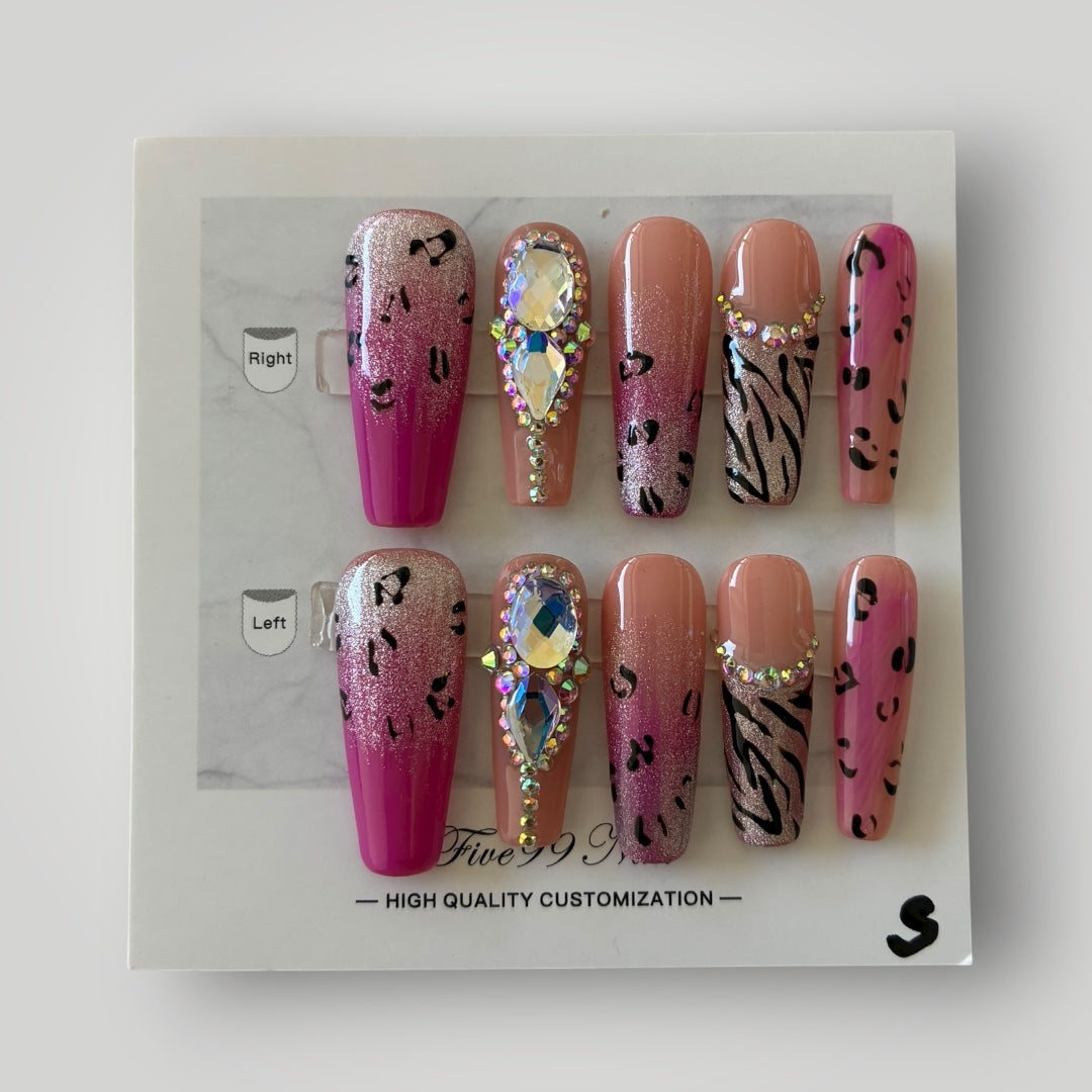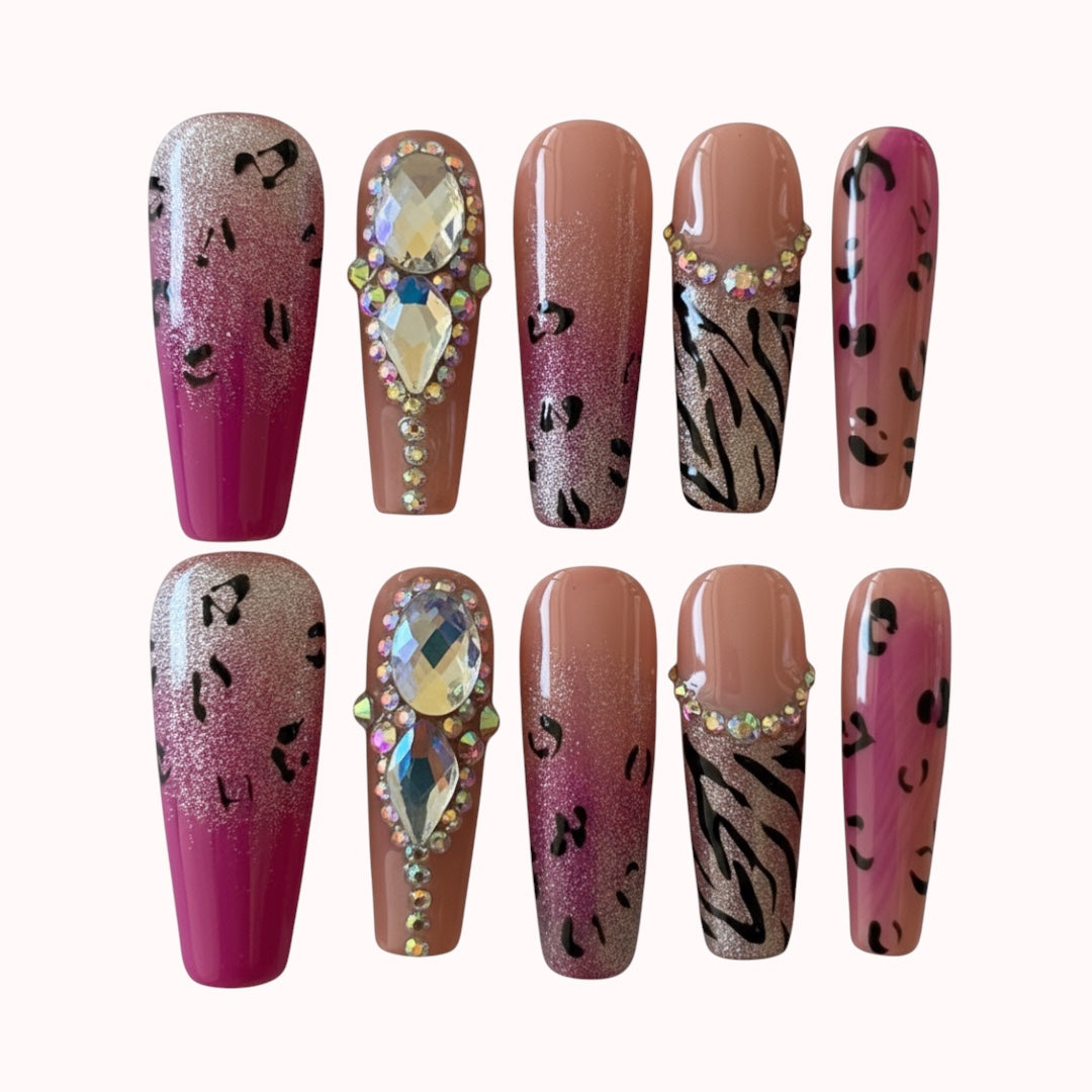 Go full glam with Savage Pink — a fierce and flirty press-on set that brings together glittery pink leopard spots, bold zebra stripes, sparkling gems, and crystal accents. It’s loud, it’s proud, and it’s made to turn heads.