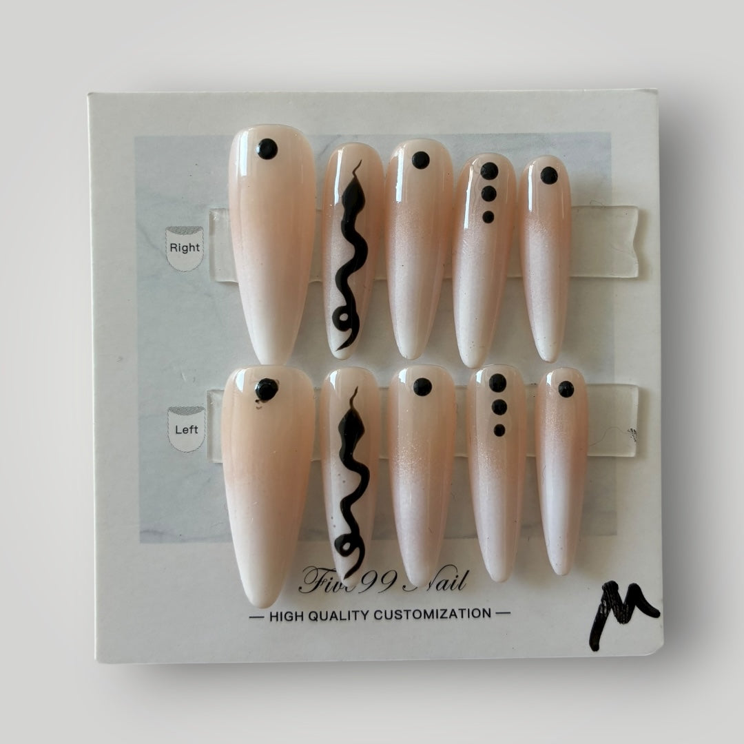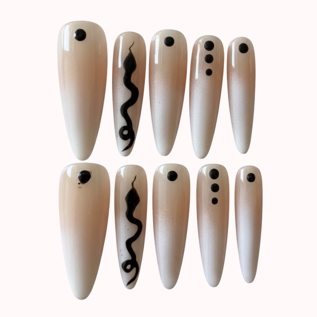 Minimalist but deadly, Serpent Silence features a matte nude gradient base accented with bold black snake art and dot motifs. Sleek, mysterious, and edgy, this set adds a daring yet clean finish to your look β perfect for those who love subtle drama with high contrast.
