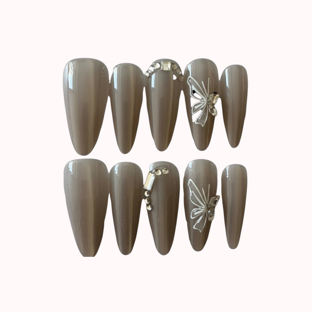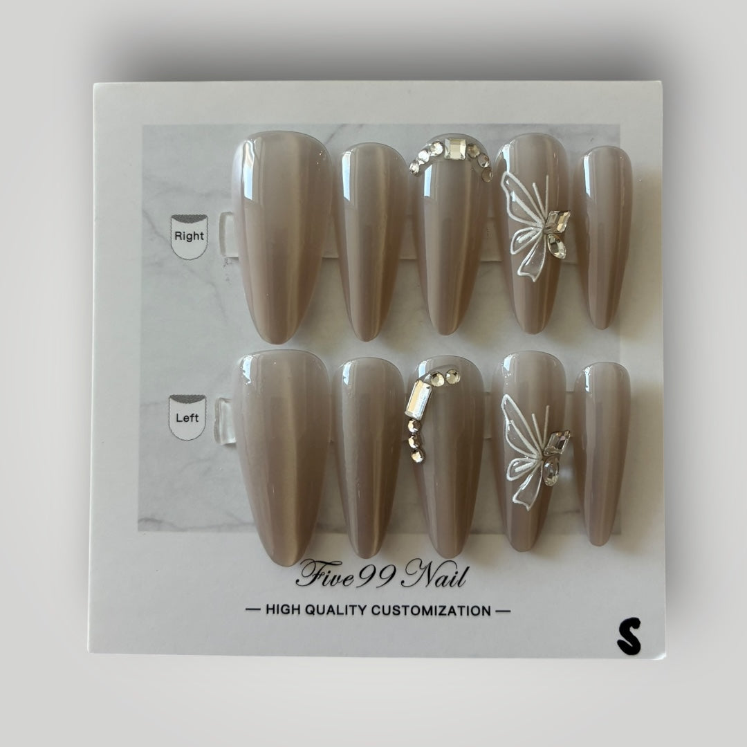 A chic smoky taupe base finished with sparkling rhinestone accents and delicate 3D bow details. Elegant yet playful, this design balances modern minimalism with feminine charm β perfect for dinners, parties, or when you want your nails to feel like jewelry.