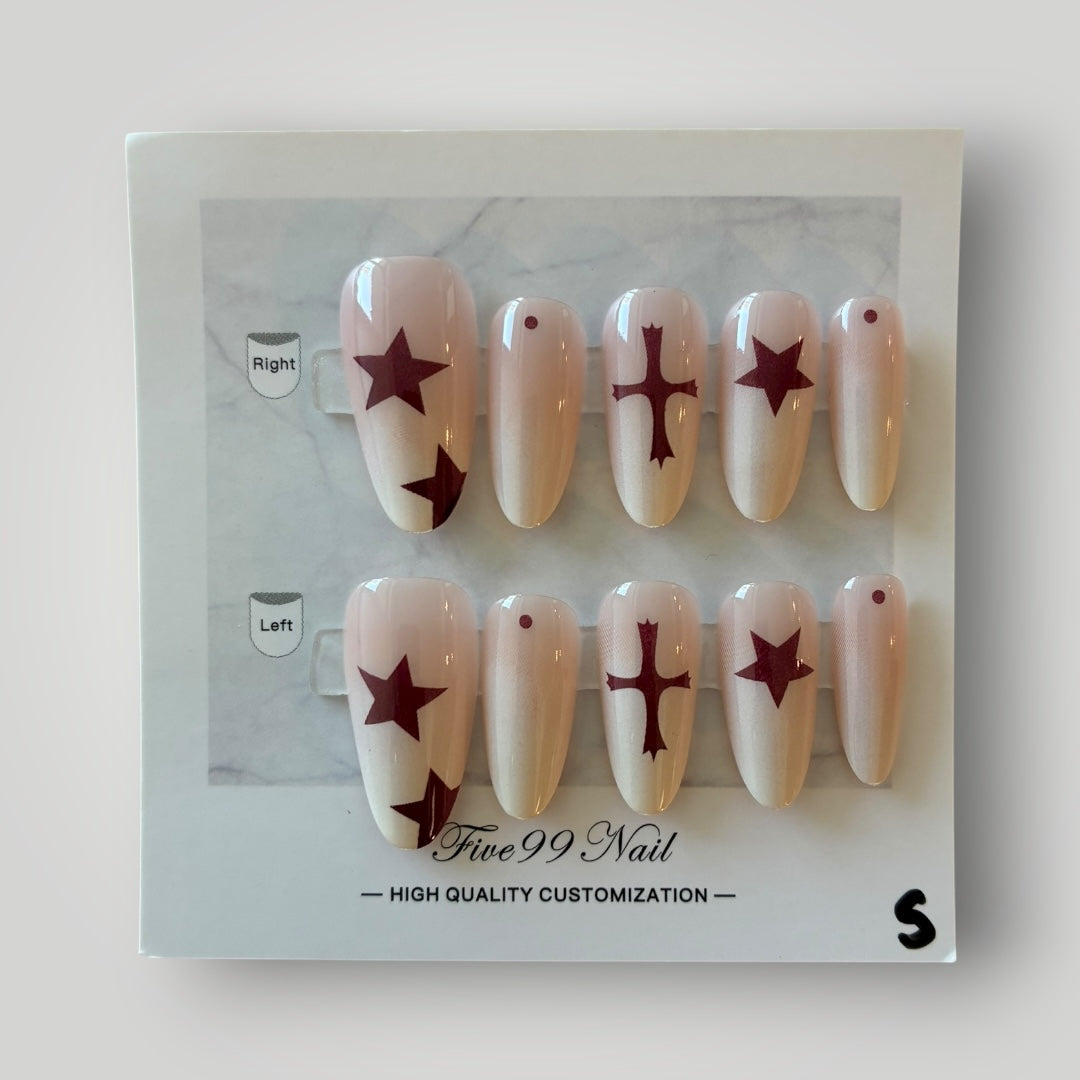 Make a bold statement with Star Pop, a street-cool set that blends creamy nude tones with standout deep red stars and mini dots. The hand-painted star graphics bring an edgy, playful vibe to your nailsβperfect for sneaker lovers, concert fits, or a pop of graphic flair.