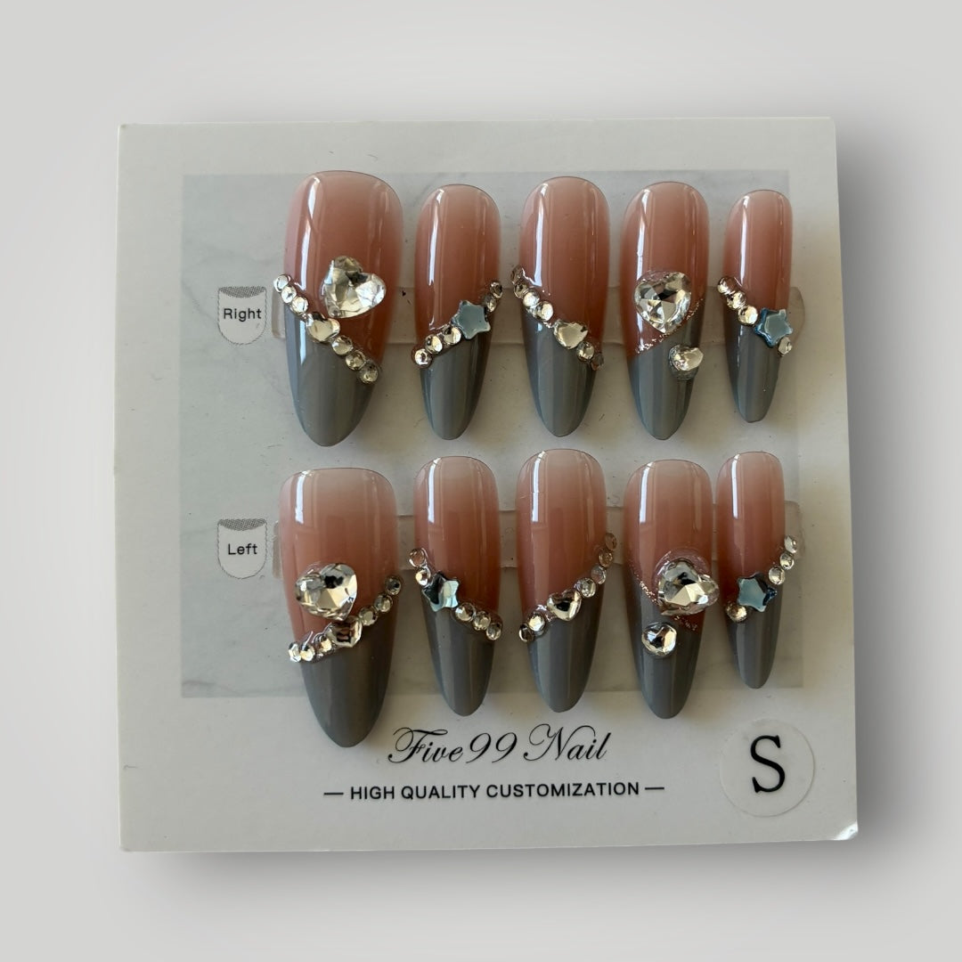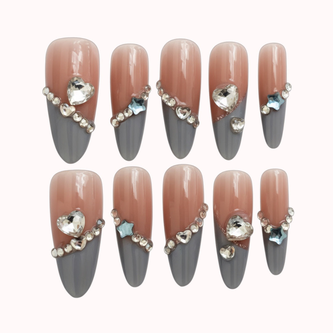 Edgy meets glam in this sharp grey and nude combo, with chrome dagger tips and shimmering rhinestones that sparkle from every angle. Featuring star and heart-shaped crystals, "Starry Dagger" is for the bold souls who shine in the dark.