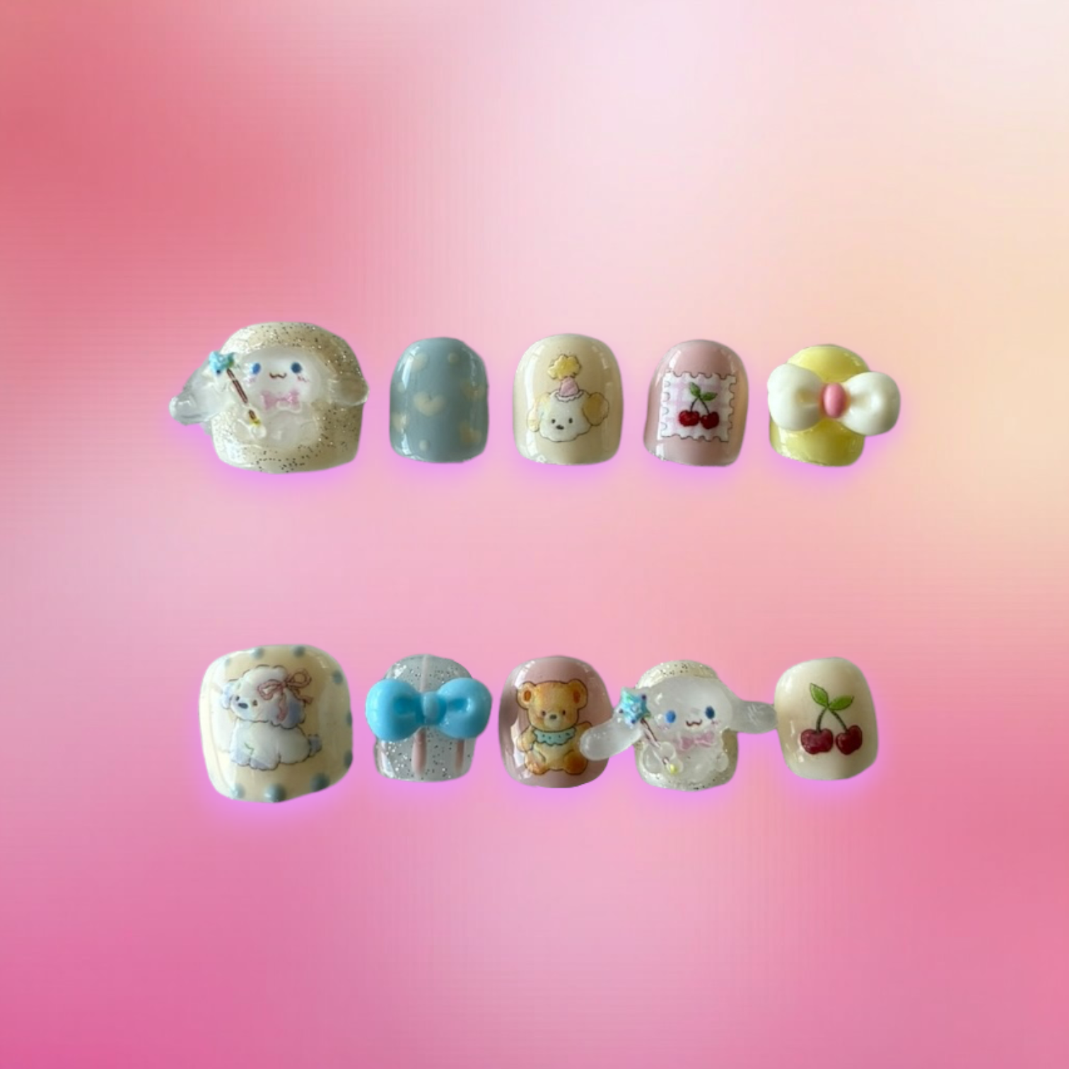 A dreamy pastel nail set inspired by kawaii childhood nostalgia β featuring adorable bears, bunnies, ribbons, and cherries in soft pink, baby blue, and lemon yellow tones. Each nail feels like a little candy world full of joy and sweetness, perfect for anyone who loves cute and playful styles.