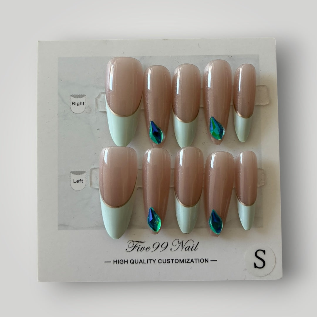 This set features a fresh minty French tip design on a glossy nude base, elevated with shimmering iridescent flame-shaped gems. A bold twist on a classic look β subtle yet striking.